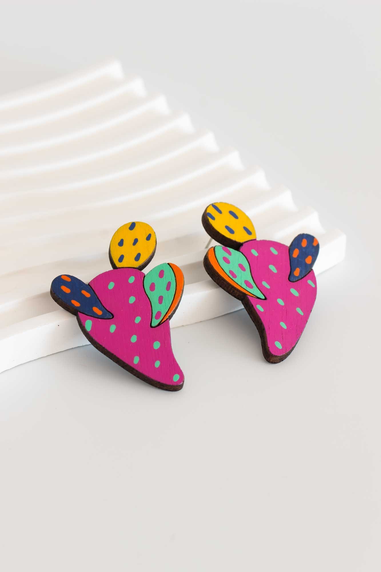 Pendientes de nuestra colección Jump, donde los estampados de las telas saltan a la madera.