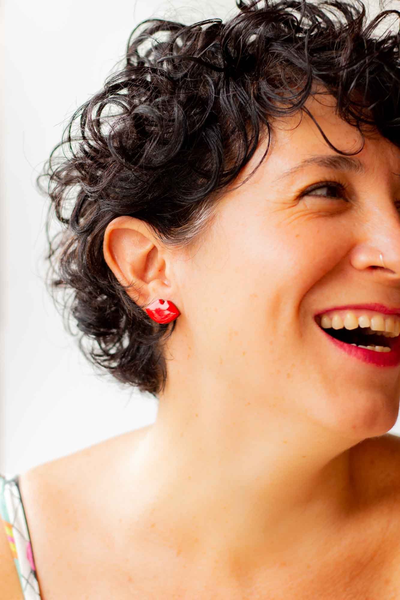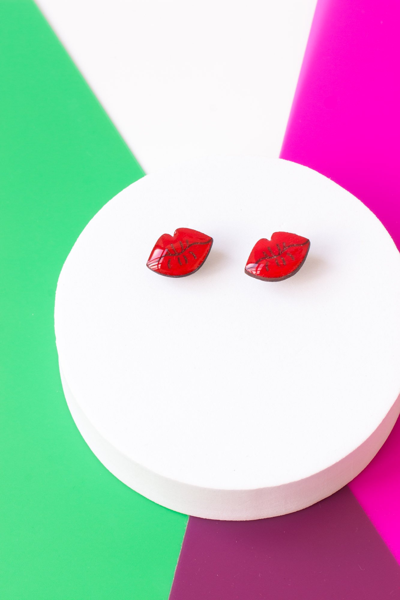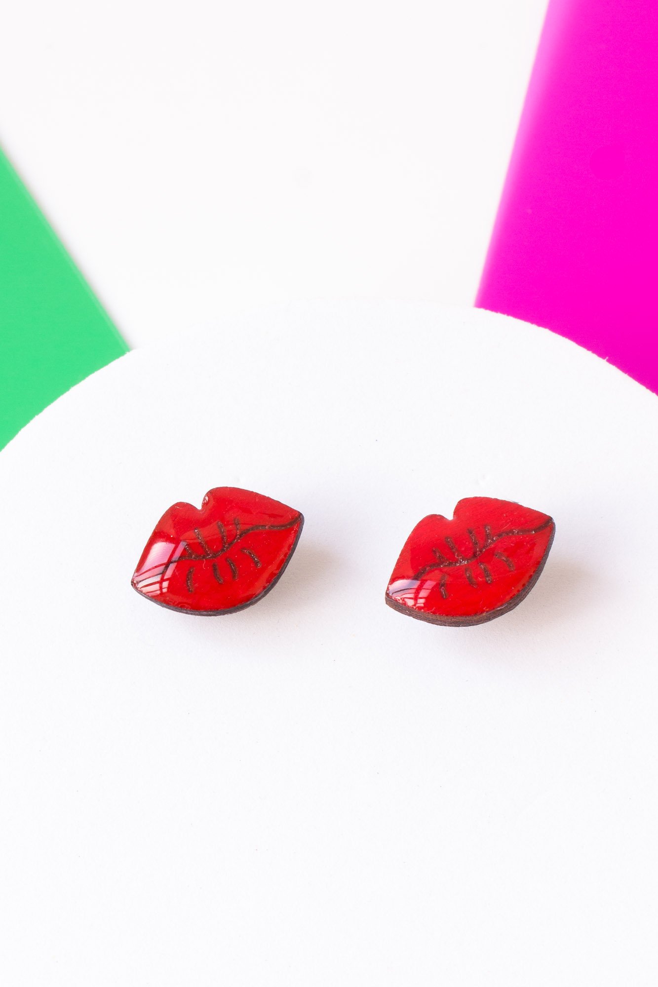 Pendientes mini de labios rojos elaborados a partir de madera recuperada de cajas de frutas.